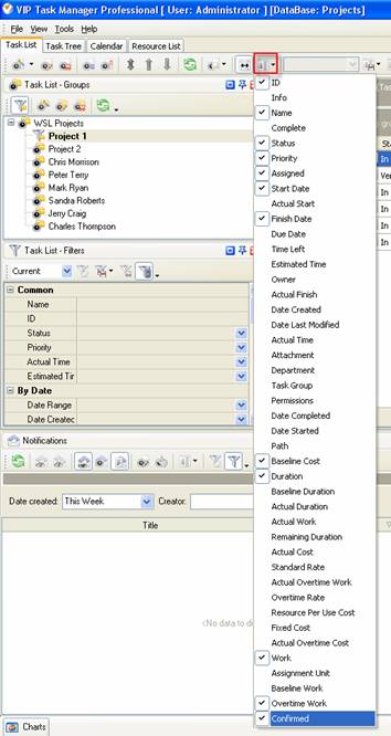 - to display the value of custom field Confirmed on Task List or Task Tree please go to Task List or Task Tree, click Task List Columns or Task Tree Columns button