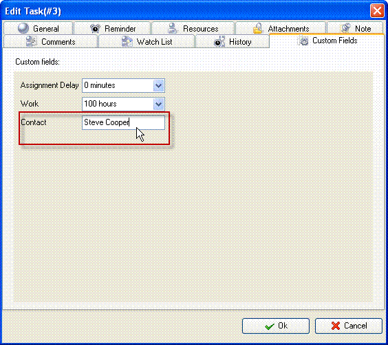 Contact custom field shows the name of the person who refers to task or project. This person can be someone other than assigned resource. For example, you have the task "Confirm arrangements with insurance company". The assigned resource (the doer of this task) is Sandra. However, the manager of insurance company Steve is also involved in the accomplishment of this task. So you can enter his name in custom field Contact.