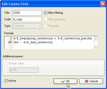 - Add custom field "Cost of Goods Sold (COGS)":