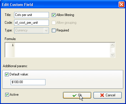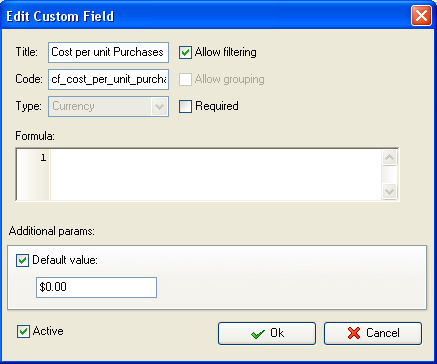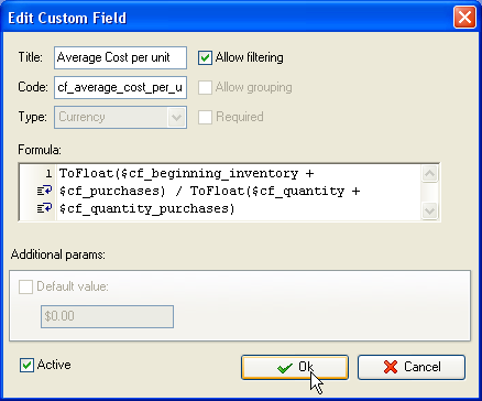 - Create custom field "Average Cost per Unit". It will be calculated according to the formula: Average Cost per Unit = (Beginning Inventory + Purchases (in money)) ÷ (Beginning Inventory + Purchases (in units)) . The formula for custom field looks like this: