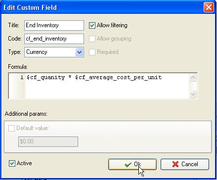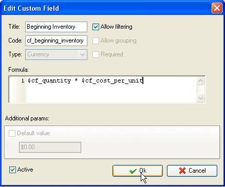 - Add custom field "End Inventory". It is calculated based on Beginning Inventory in units (Quantity) and Cost of Goods Sold: