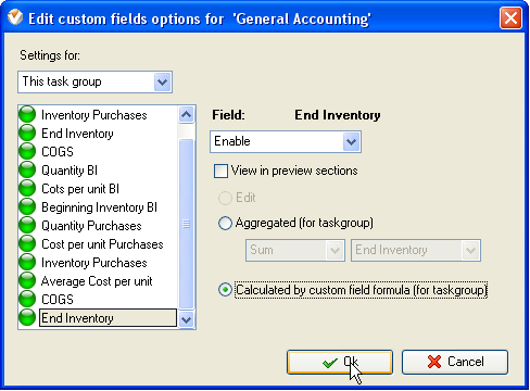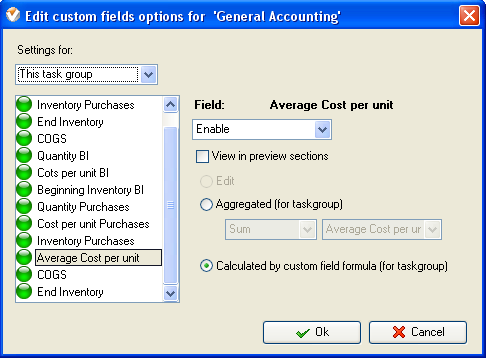 - Select custom field "Average Cost per Unit", "COGS" and "End Inventory" set the following settings for these custom fields: