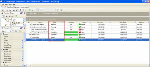 approved. Task marked with status "Reject" can switch to "Skip" or "Complete".