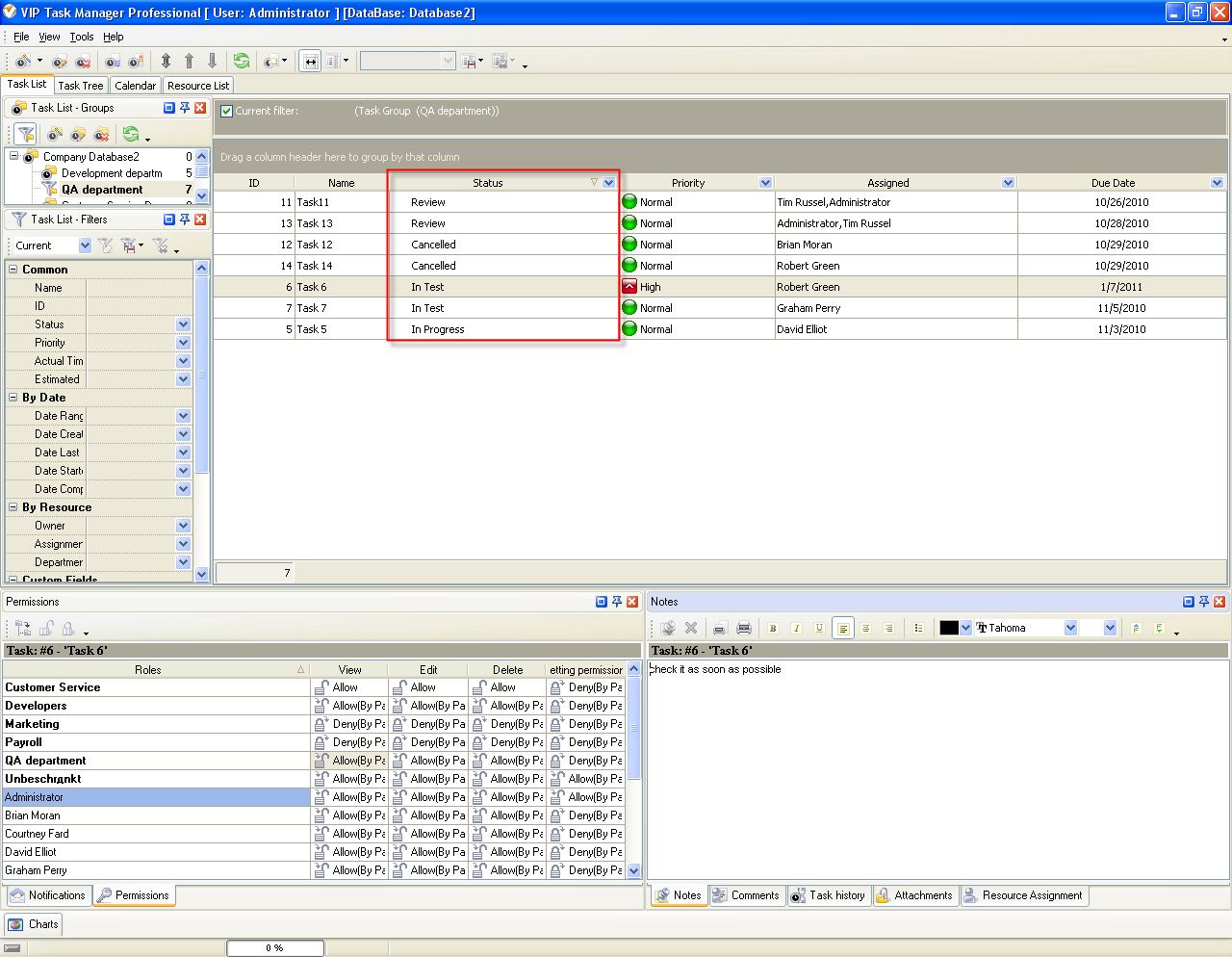 Test", "Cancelled" and "Review".