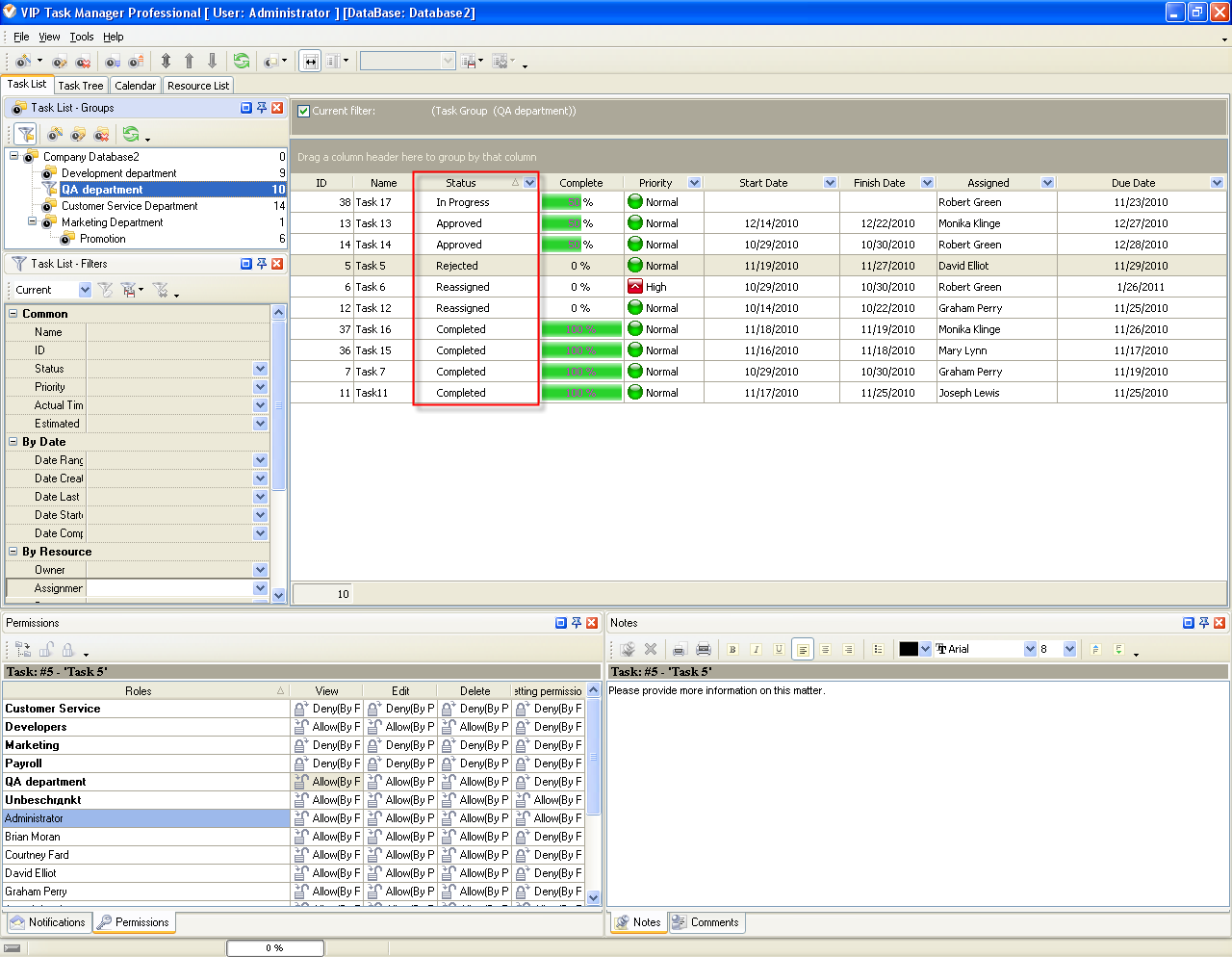 The task is marked with status "In Progress" when Administrator or any responsible person initiates the task or the delegated resource has already performed some work on it.