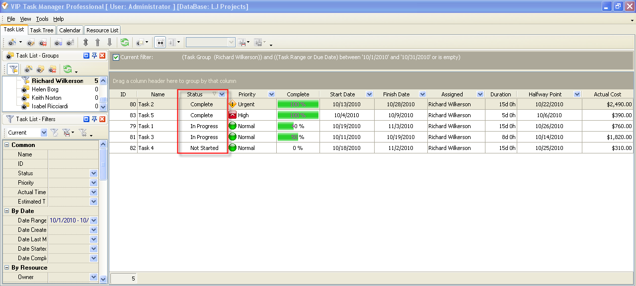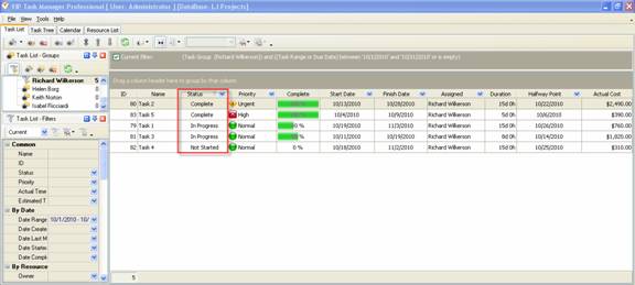 Task Status "In Progress" shows that the task is in process of being completed. All tasks with Percent Complete 1-99% have status "In Progress". Once you update Percent Complete of the task to 50%, for example, the status of this task will be automatically updated to "In Progress".
