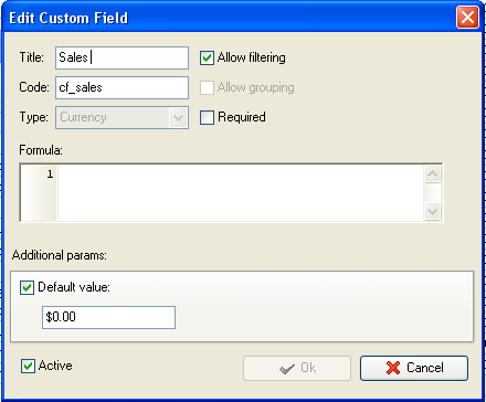 - Add the custom field “Sales” with code “cf_sales” and Type “Currency”