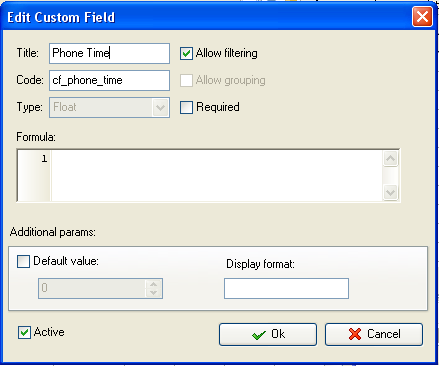 - Add the custom field “Phone Time” with code “cf_phone_time” and Type “Float”