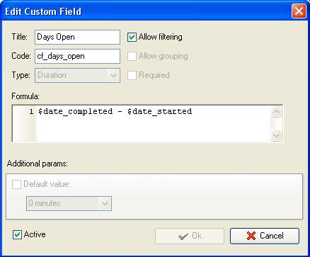 - Create custom field “Days Open” with Type “Duration” and the formula: