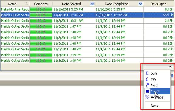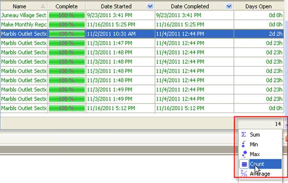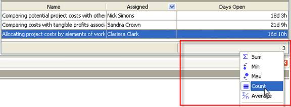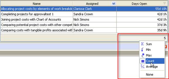 - To see the number of open tasks set footer, right click under column ”Days Open” and select “Count”