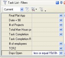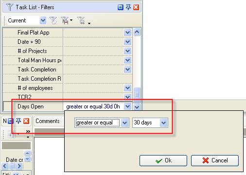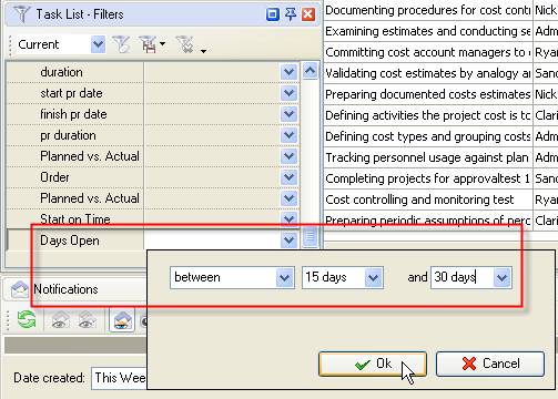 - To see how many tasks are open between 15 and 30 days set filter “between” and enter “15 days” and “30 days” for the custom field “Days Open”