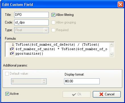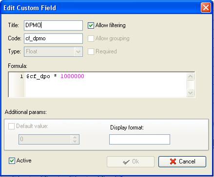 - Add custom field “DPO” or “Defects per Opportunities” with code “cf_dpo” the formula: