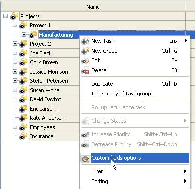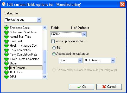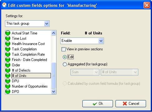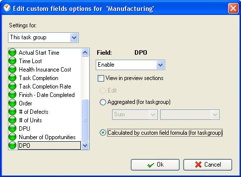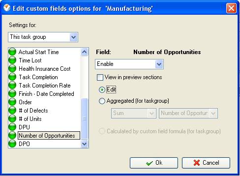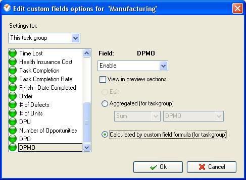 - On Task Tree select task group for which you need to display “Defects per Opportunities” and select “Custom fields options”