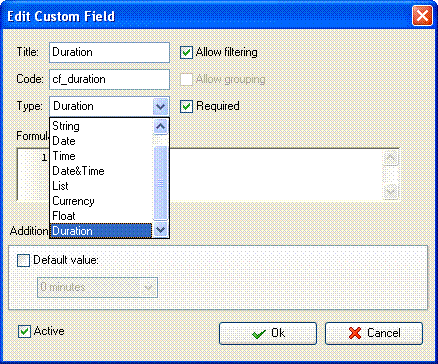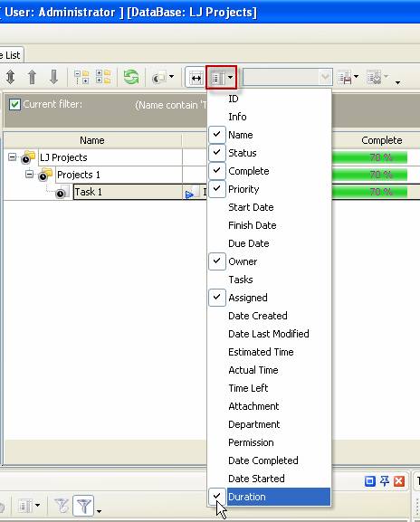 - to display the value of custom field Duration on Task List or Task Tree please go to Task List or Task Tree, click Task List Columns or Task Tree Columns button
