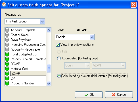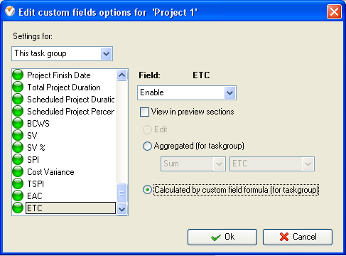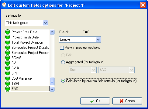 - On Task Tree select the task group for which you need to display Estimate at Completion (EAC) per Project and select “Custom fields options”