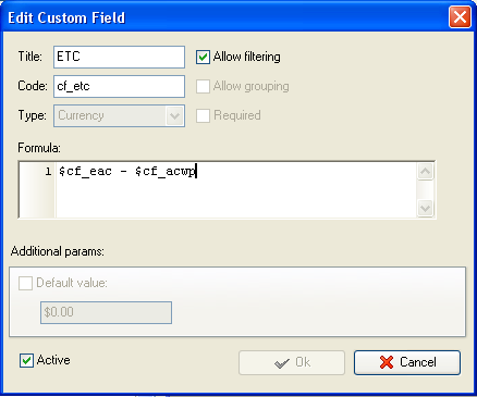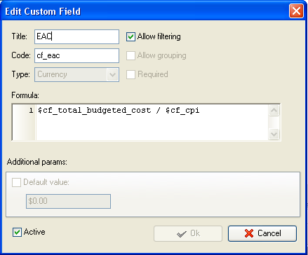 - Add the custom field “EAC” (Estimate at Completion) with code “cf_eac” and the formula: