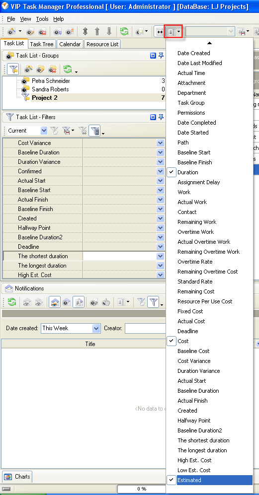 7. to display the value of custom field Estimated on Task List or Task Tree please go to Task List or Task Tree, click Task List Columns or Task Tree Columns button and check the custom field "Estimated"