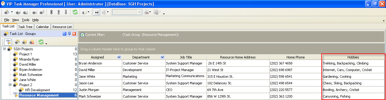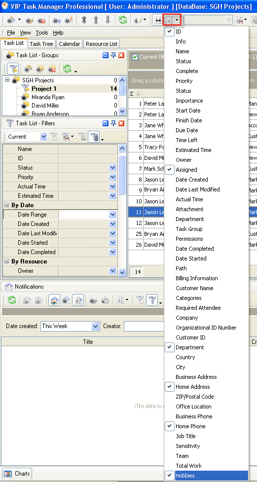 5. to display the value of custom field Hobbies on Task List or Task Tree please go to Task List or Task Tree, click Task List Columns or Task Tree Columns button and check the custom field "Hobbies"