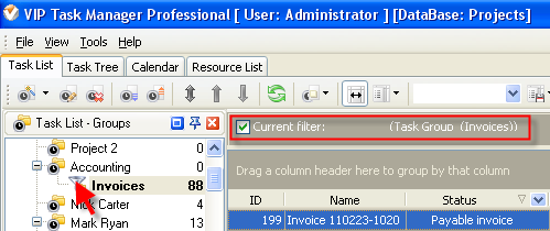 • If you need to view the number of overdue invoices and the total or average monetary value of overdue invoices per particular project on Task List, filter your to-do list by task group with project tasks.