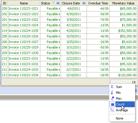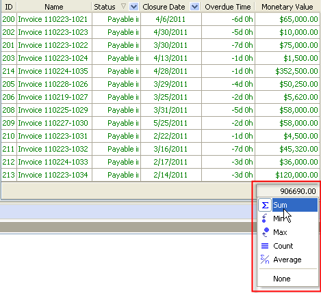 • select "Sum" to display total monetary value of overdue invoices