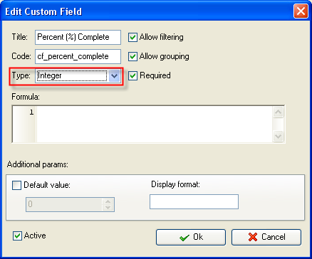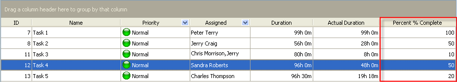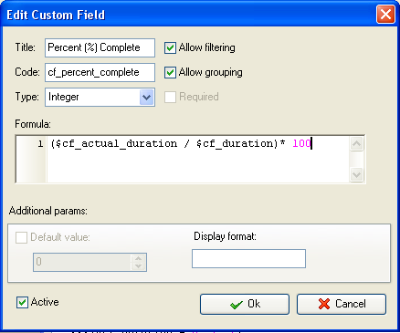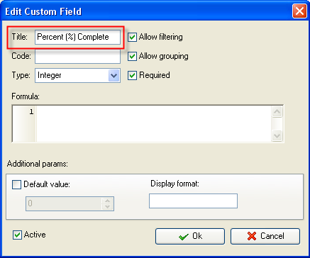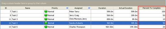 The custom field "Percent (%) Complete" (or "Complete" by default) shows