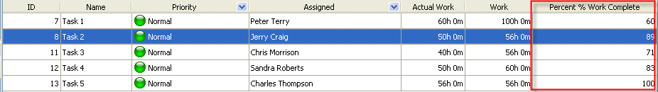 Work Complete custom field shows the percentage of task completion based on Actual Work.
