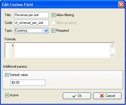 custom field "Revenue per unit" with Code "cf_revenue_per_unit". Add the