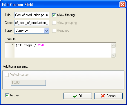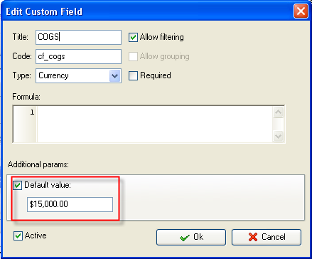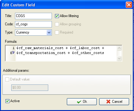 custom field "COGS" (Cost of Goods Sold) with Code "cf_cogs"