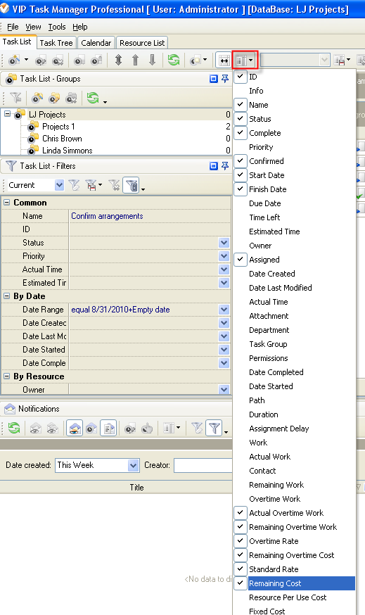 7. to display the value of custom field Remaining Cost on Task List or Task Tree please go to Task List or Task Tree, click Task List Columns or Task Tree Columns button and check the custom field "Remaining Cost"
