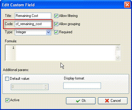 4. in "Code" field enter "cf_remaining_cost"