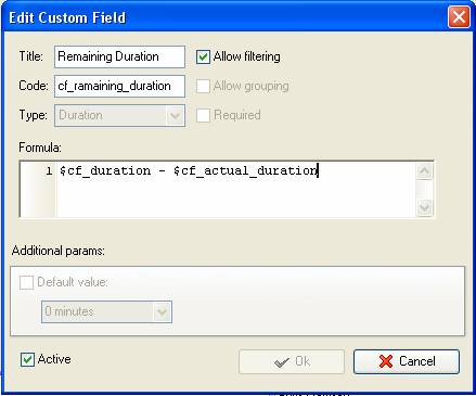Remaining Duration custom field shows remaining time needed to complete the task. Duration custom field is based on such units as Duration and Actual Duration