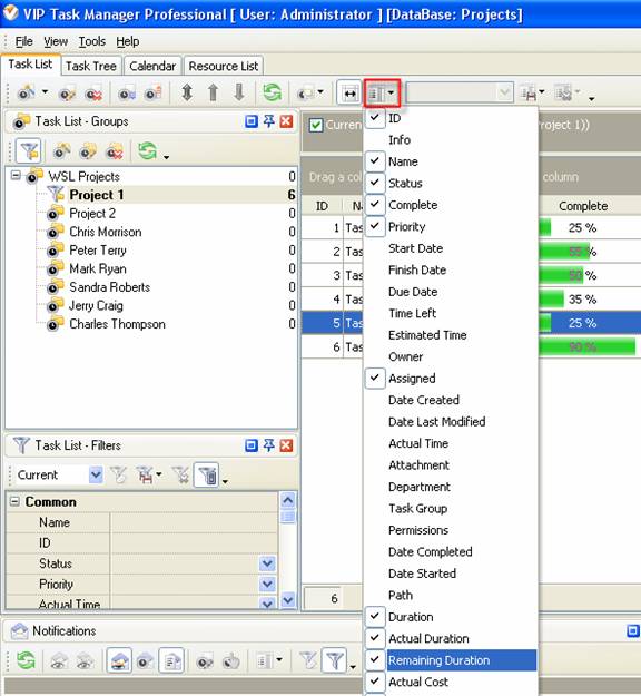 - to display the value of custom field Remaining Duration on Task List or Task Tree please go to Task List or Task Tree, click Task List Columns or Task Tree Columns button