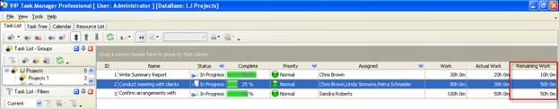 for example, the task "Write Summary Report" is scheduled for 30 hours of work. The assigned resource has reported 20 hours of actual work so far. by viewing custom field Remaining Work you see that 10 hours are left to complete this task.