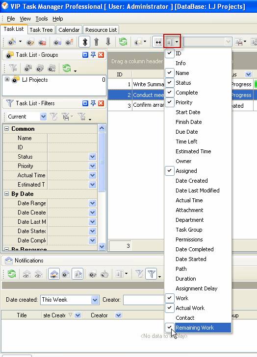 7. to display the value of custom field Remaining Work on Task List or Task Tree please go to Task List or Task Tree, click Task List Columns or Task Tree Columns button and check the custom field "Remaining Work"