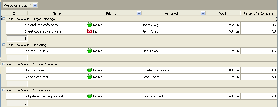 Resource Group custom field shows the group to which the assigned resource belongs. For example, you may have Marketing, Project Manager, IT-Department, etc.