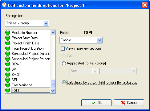 - On Task Tree select the task group for which you need to display To Complete Schedule Performance Indicator (TSPI) per Project and select “Custom fields options”