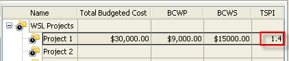 For example, if Total Budgeted Cost of a project is $30 000 USD, BCWP of the project is $9 000 USD at certain date and BCWS is $15 000 USD at the same date, TSPI is calculated as follows: