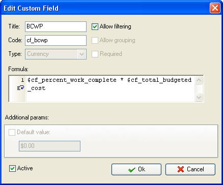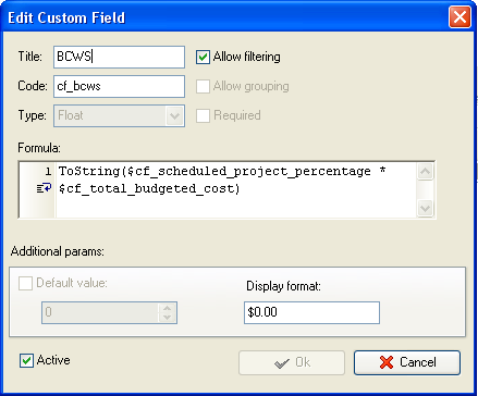 - Add the custom field “BCWS” (Budgeted Cost of Work Scheduled) with code “cf_bcws”
