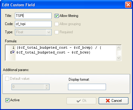 - Set the following custom fields settings for the custom fields: “Total Budgeted Cost”, “BCWP”, “BCWS” and “TSPI”