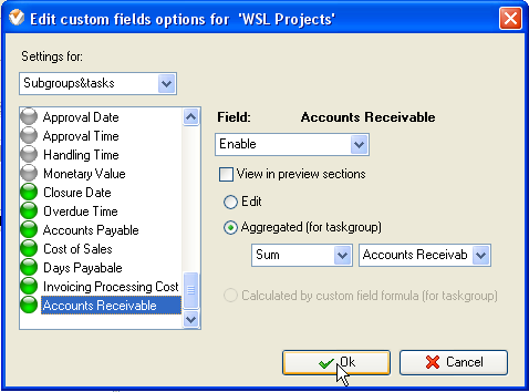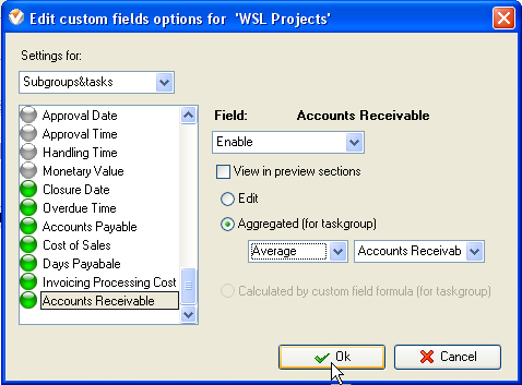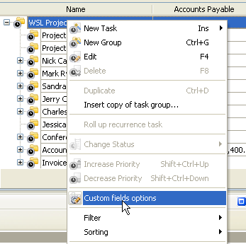 - Select task group for which you need to view the total or average accounts receivable, right click and select "Custom fields options"