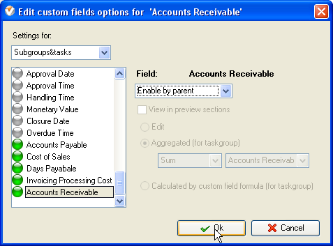 - Select custom field "Accounts Receivable" and select the option "Enable by parent".