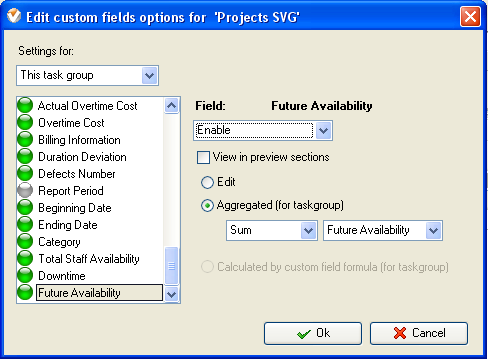 - To enable the displaying of total and average value of this KPI select the root or parent task group and click "Custom fields options"