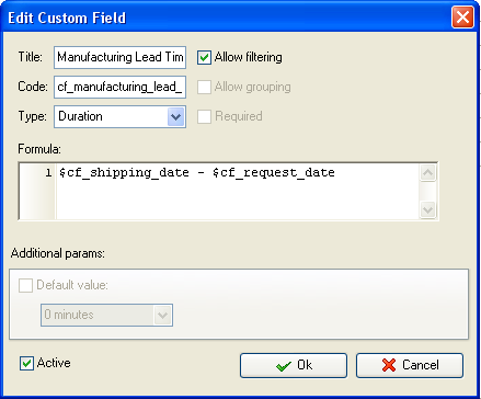 - In “Code” field enter “cf_manufacturing_lead_time”