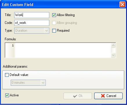 - Add custom field “Work” with Code “cf_work” and Type “Duration”