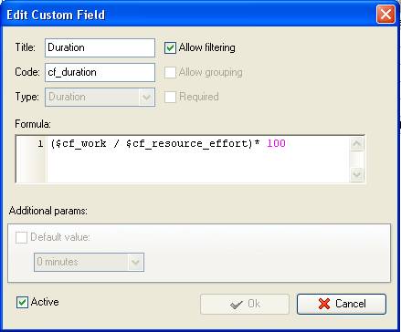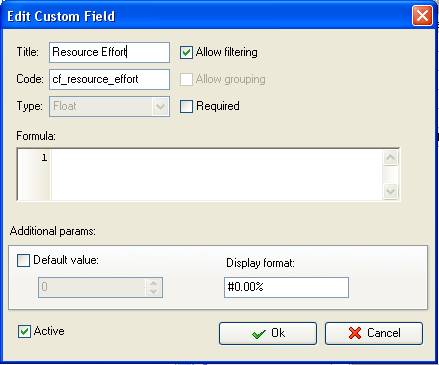 - Add custom field “Resource Effort” with Code “cf_resource_effort” and Type “Float”