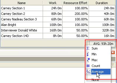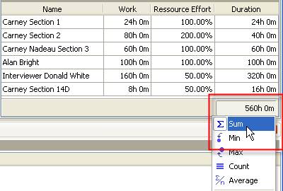 - Right click under the column “Duration” and select “Sum” to display total task Duration based on Resource Effort
