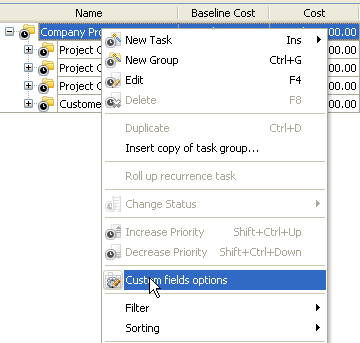 - To enable the displaying of the total deviation of planned budget for task groups select the root task group and click "Custom fields options"