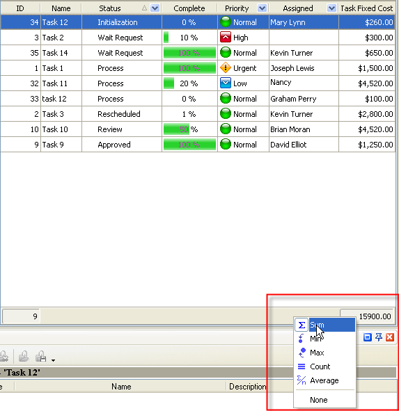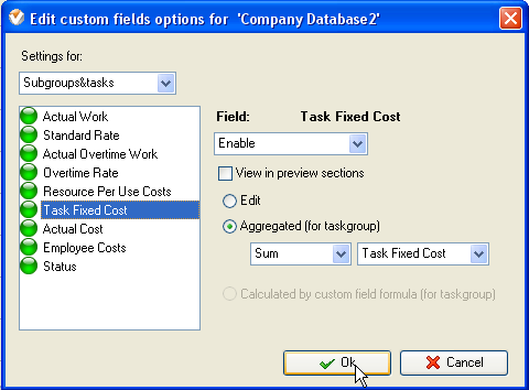 - select “Sum” and the custom field name “Task Fixed Cost” (or