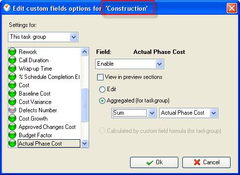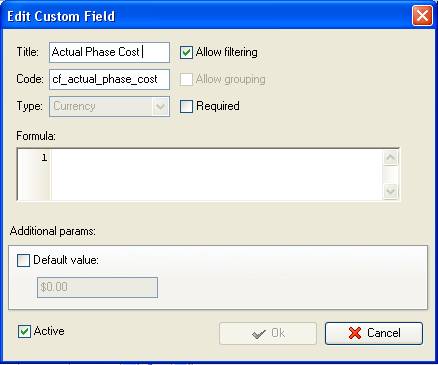 - Add the custom field “Actual Phase Cost” with Code “cf_actual_phase_cost”, Type “Currency” and one of the abovementioned formulas.