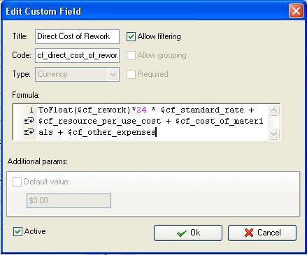 - Add the custom field “Direct Cost of Rework” with code “cf_direct_cost_of_rework” and Type “Currency”. Use one of the fomulas above to calculate Direct Cost of Rework